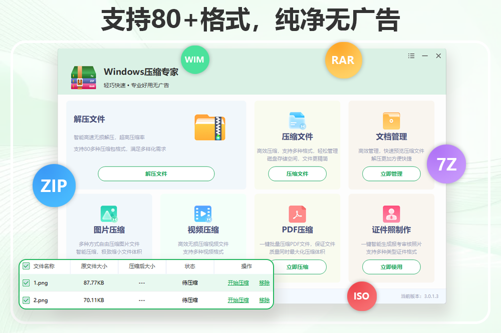 Windows压缩专家是一款高效的解压缩工具,轻巧无广告。支持多种压缩格式,同时支持图片压缩,视频压缩,PDF压缩、智能证件照。 文件解压缩:高效解压缩,支持多种文件格式,将您的文件压缩到小体积。 图片压缩:自定义尺寸/分辨率,支持批量压缩,多种方式压缩,灵活满足需求。 视频压缩:智能挑选压缩算法,保持视频清晰,超省存储空间。 PDF压缩:PDF文档一键高效无损压缩。 智能证件照:一键制作各类证件照,兼容各类证件照需求,简单便捷。