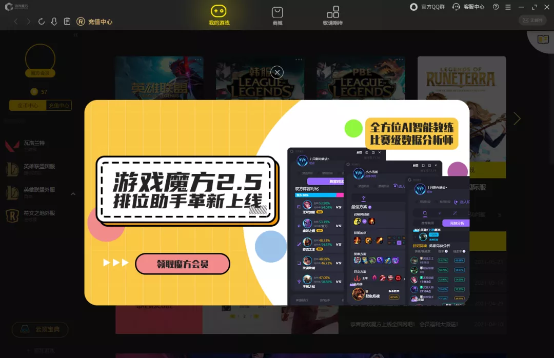 游戏魔方是一款英雄联盟绿色插件,具有英雄联盟排位助手,海牛助手,一键符文装备推荐,外服翻译,云顶宝典,战绩查询等功能。