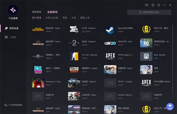 TT游戏加速器一款专门针对Steam、Origin、战网等各大平台网络游戏加速产品,有效解决玩家在网游中遇到的延时过高、登录困难、容易掉线等问题,开黑超低延迟低不掉包,热门网游全部支持,高速稳定、电竞专线,TT加速器保障每一位玩家的游戏体验。