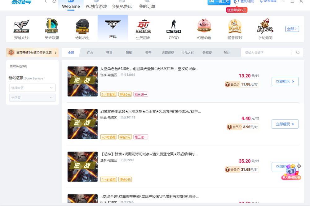 易租号是一个专业的游戏租号平台,为玩家提供覆盖了端游、手游、加速器、影视、音乐等高级账号。有了易租号,您可以轻松实现:王者荣耀租号、和平精英租号、CF租号、英雄联盟LOL租号和绝地求生租号等,高端帐号即时体验!