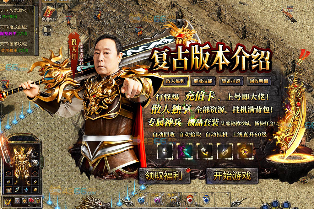 2025热门传奇版本-帝王霸业,倪大红老师热情代言,为玩家送上百万真充,新人超高福利,开局免费领取自动拾取、自动回收、自动合成,一怪一光柱,BOSS爆真充,神装全靠打,终身领福利。只需试玩3分钟,重燃激情,找回当年的激情;