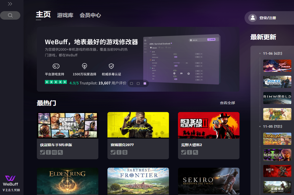 包含艾尔登法环修改器、泰拉瑞亚修改器、荒野大镖客修改器、看门狗修改器、赛博朋克2077修改器、GTA5修改器等上千款热门单机游戏修改器,修改器功能包括无限生命、无限金钱、无限子弹、无敌模式、超级速度、超级伤害等,通过WeBuff修改器玩家可大大提高游戏体验,一键加buff、操作更便捷、功能更全面,是单机游戏玩家必备的单机游戏修改器。