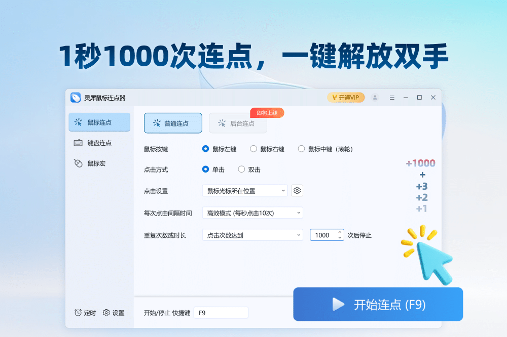 一款简单高效的自动化点击工具,能帮助用户轻松实现鼠标全自动连续点击,1秒可高达1000次,无论是游戏挂机、办公自动化,还是网购抢票秒杀、数据录入等高频点击任务,它都能精准稳定地执行操作。