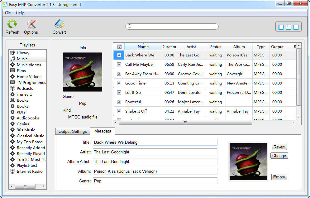 Easy M4P Converter 是一个简单的移除iTunes DRM的软件, 它以合法地方式移除 iTunes DRM 保护从 M4P 歌曲, 苹果音乐和电子书, 并转换购买的 iTunes M4P 到最常用的音频格式, 例如 MP3, M4A, MKA, AAC, AU, M4R, AC3,AIFF, FLAC 等。Easy M4P Converter 无缝集成 itunes, 使您可以即时访问 itunes 音乐库和播放列表信息。支持以涡轮速度转换多个 DRM 保护音乐、电子书和不受保护的音频文件。因此, 您可以在 itunes 库或播放列表中快速转换所有 itunes 歌曲、电子书和苹果音乐。此外, Easy M4P Converter 支持转换不受保护的音频和有声格式, 如 AAC, M4A, M4R, WAV, MP3, MKA, AC3, AIFF, 电子书 M4B, AA 和 AAX 等。这是特别有用的, 如果你从 iTunes 音乐商店购买的曲目, 你想听他们在媒体设备, 这不支持其格式, 因为这些音乐曲目是 DRM 保护。简单的 M4P 转换器, 让您享受您的苹果音乐自由, 没有任何限制你喜欢的设备。完全兼容 iTunes 和 Windows 10。支持多语言。
