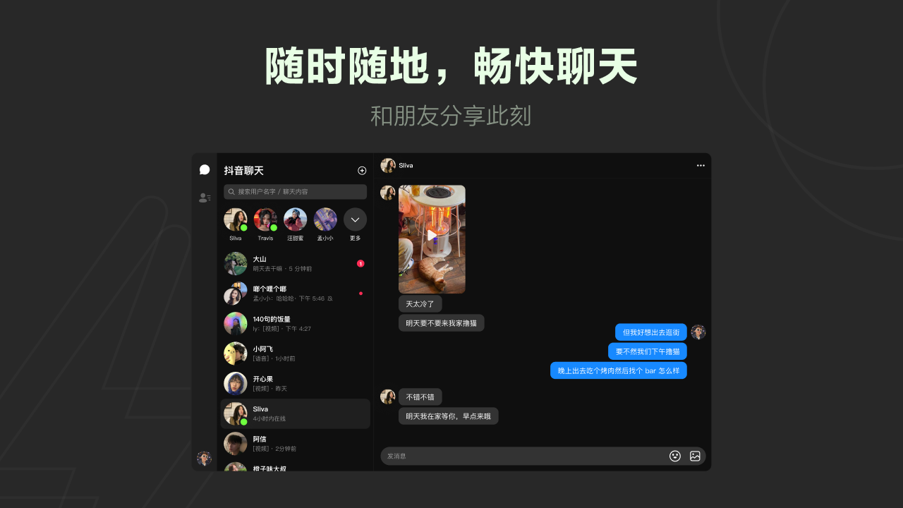 热爱抖音的你,现在多了一种交流方式。 下载抖音聊天,工作与学习之余,和你的抖音好友持续保持联系 在这里,你可以: - 随时随地收发消息,和朋友分享此刻 - 浏览朋友分享的内容,共享精彩瞬间 - 知晓朋友的在线状态,有陪伴不孤单 - 管理消息记录,多端同步不丢失 - 添加新的朋友,认识更多小伙伴