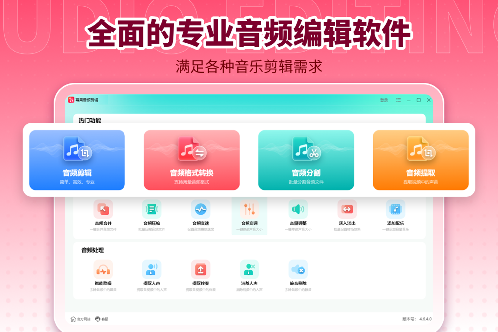 幂果音频剪辑软件或许是你所看到的易于使用的音频音乐剪辑软件!新手也能轻松一步完成,人性化的音乐剪辑界面清晰看到音频制作的每一帧每一个声音,轻松实现各种音频编辑制作,是一款出色的音频剪辑、音频剪切、音频合并应用,100%易于使用的音乐编辑器和铃声制作软件。
