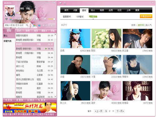 MVBOX是一款集音频、视频于一体的多媒体娱乐软件,它具有高音质流行歌曲和丰富的网络原创歌曲KTV资源,通过它您不仅可以在线听歌、K歌,还可以高质量的录制自己的卡拉OK歌曲和有清晰画面的MTV;同时,MVBOX还给您提供了强大的虚拟视频功能,使您在与他人使用QQ、UC、MSN等进行视频聊天时,可以很方便的利用画中画、调色板、滤镜和抠象、特效等功能来美化您的摄象头;您既可以播放电影、MTV、图片到虚拟摄像头与网友共享,还可以对您的视频或照片添加各种大头贴特效,从此使您的视频更加绚丽多彩,不再单调,为您创造一个虚幻的魅力世界,让您在朋友中以靓丽的形象脱颖而出;MVBOX的清晰视频捕获功能,很方便的让您与朋友互动交流、在线实时演示、网上教学和转播网络电视电影;高保真的录音录像功能还可以使您很方便的录制自己想要的网络资源并可DIY制作您的MTV作品。该软件拥有小巧精致、操作简捷、不占资源、功能强大的特点,深得用户喜爱,并且成为目前国内最受欢迎的简单实用的卡拉OK音乐播放和虚拟视频软件。