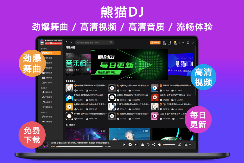 熊猫DJ每日发布最新最热DJ舞曲,把百万DJ曲库装进你的手机音乐播放器,随时随地跟着节奏舞动起来。超全的音乐分类,满足你不同的需求:抖音热门歌曲、车载音乐,车载大碟,夜店蹦迪音乐、电音、重低音、喊麦现场,网络红歌,舞曲串烧应有尽有!