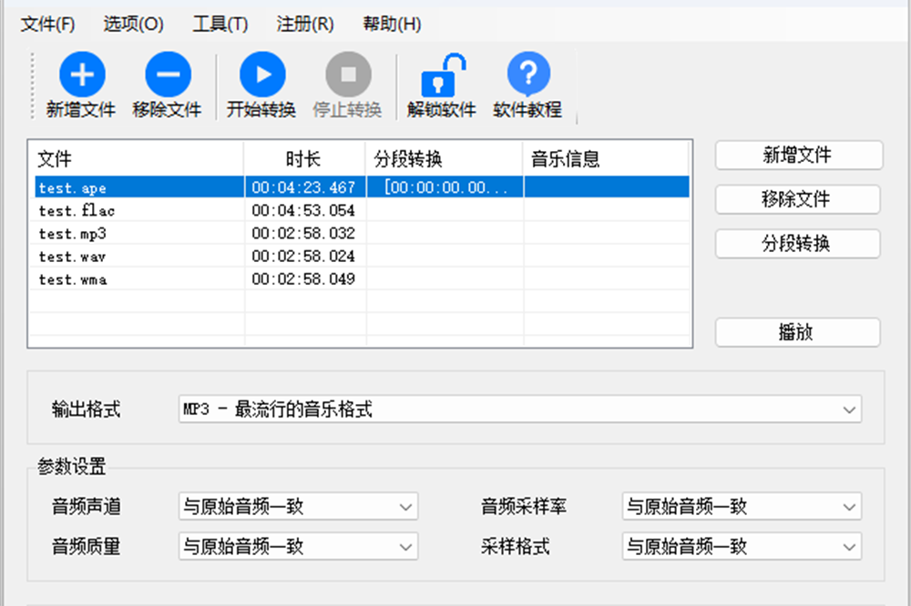 金飞翼音频转换大师是一款功能强大的音频格式转换工具。它既可在WAV、MP3、WMA、AAC、OGG、RM/RA、FLAC、AMR、MP2、G726等各种常见格式之间互相转换,也同时支持同一种音频格式在不同压缩率间的转换。此外,它还支持分段转换,您可将一长段音频按时间分割成多个小的部分。典型应用如WAV转换为MP3、MP3转换为WMA、AAC转换为MP3、WAV压缩、MP3压缩、AAC压缩、MP3截取、FLAC截取等任何您需要的音频操作。
