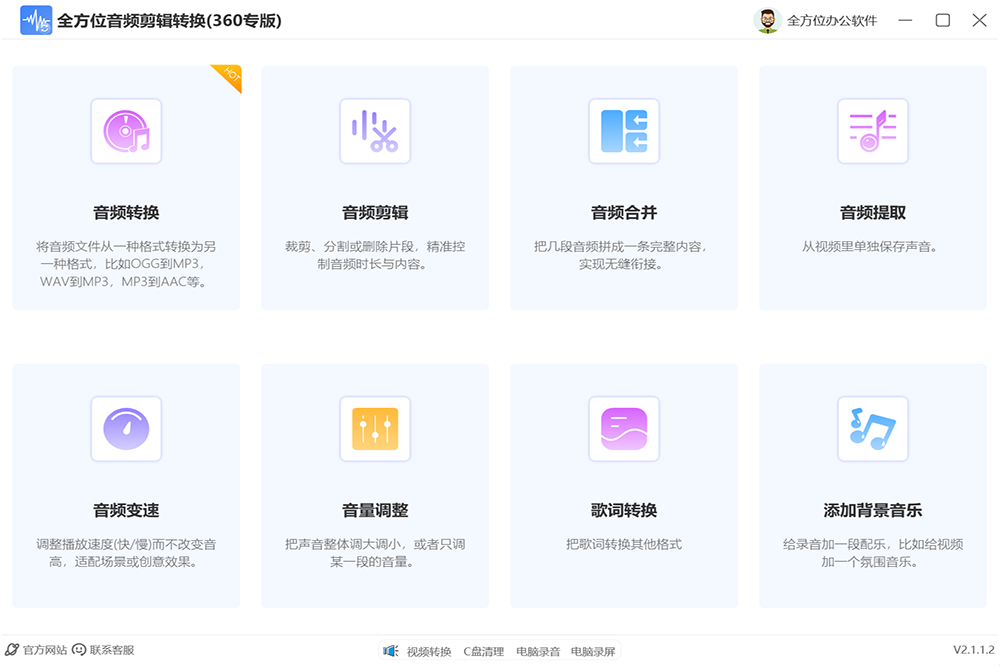 一款免费,同时支持音频转换和音频剪辑的软件。 音频转换格式支持:mp3/wav/ogg/flac/mp2/m4a/m4r/ac3/amr/wma/aiff/aifc/caf/aac/ape/au/ awb/dff/dsd/dsf/dst/mmf/wv/voc/3gpp/tkm/m4b/sacd/cda/gpga/dts/mgg/mgg0/mgg1/mflac/mflac0/qmc0/qmc3/qmcflac/qmcogg/mggl/ncm/kgm/kgma/kwm/kya/vpr/vms/xm/xm2/xm3/mg3d/kgg/mp4 音频剪辑支持:音频剪辑,音乐剪辑,音频编辑器,音乐编辑器,铃声制作,音频剪切,音乐剪切,音频合并,音频变速,音频分割.,音频格式转换,剪切、复制、粘贴、插入音频、音频变速、添加背景音乐、等多种编辑功能,支持音频文件进行任意时间段的切割;2.编辑导出后的音质不变