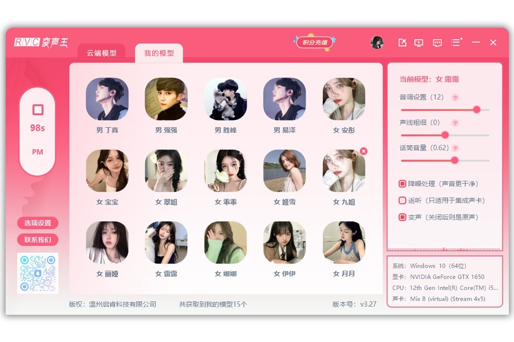 RVC变声王(AI变声器),是一款最接近真实声音的实时变声器。基于 VITS的语音合成系统,并且适用于直播和视频录制等多种场景。配置要求:为了更好的运行RVC变声王软件,你需要配备一台高性能的电脑,推荐使用第13代英特尔酷睿处理器、至少 64GB 内存以及 NVIDIA RTX 4070或以上的显卡,需要注意的是,目前RVC引擎 只支持 NVIDIA 显卡。后期的版本可能会不断更新并兼容其他类型的显卡。