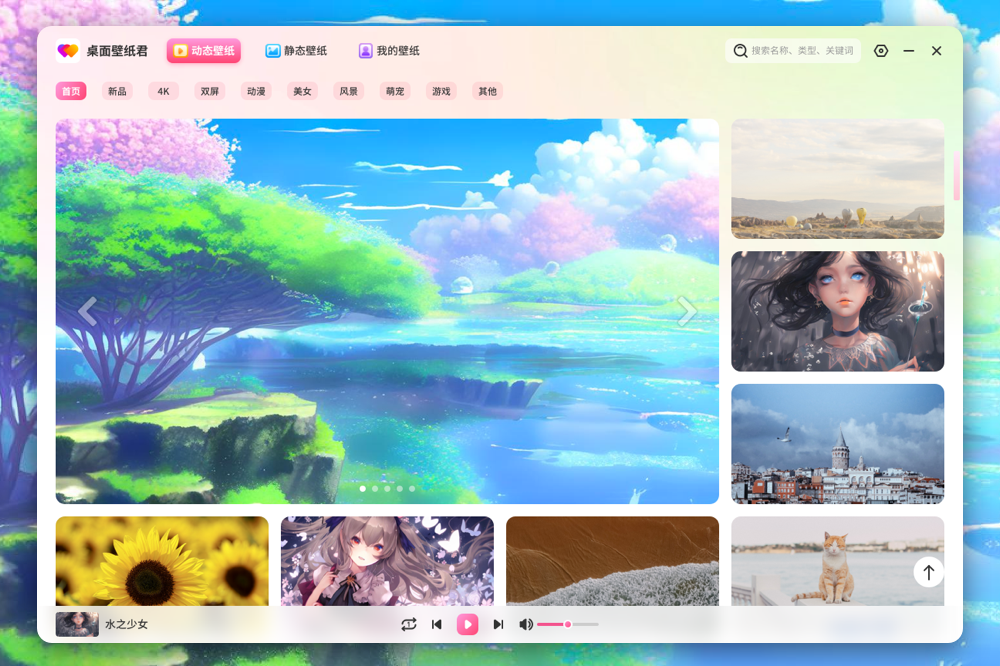 桌面壁纸君是一款功能强大的动态桌面壁纸软件,超多壁纸资源,满足各种壁纸幻想。 海量精美动静态壁纸逐步加入中~ 后续更新电脑系统美化功能和丰富的小组件,你想到的我们可以有,想不到的也可以有