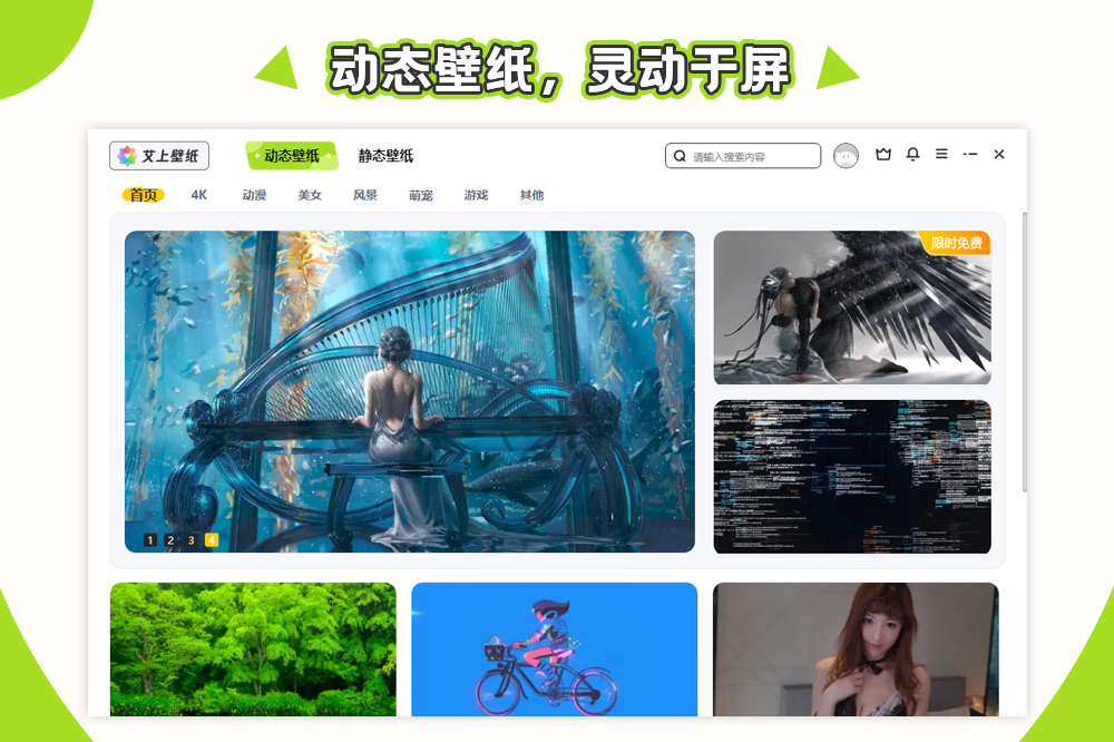 艾上桌面壁纸是一款免费优质的桌面壁纸和美化软件,海量授权超清绝美的动静态壁纸,还能一键轻松整理你的桌面,让软件、文件等不同种类分别展示,整个桌面干净、整洁、炫酷。独家研发桌面壁纸渲染引擎,真实还原雨雪光特效和各种粒子效果,让静态壁纸动起来,效果栩栩如真,为你打造电脑桌面的绝美盛宴。