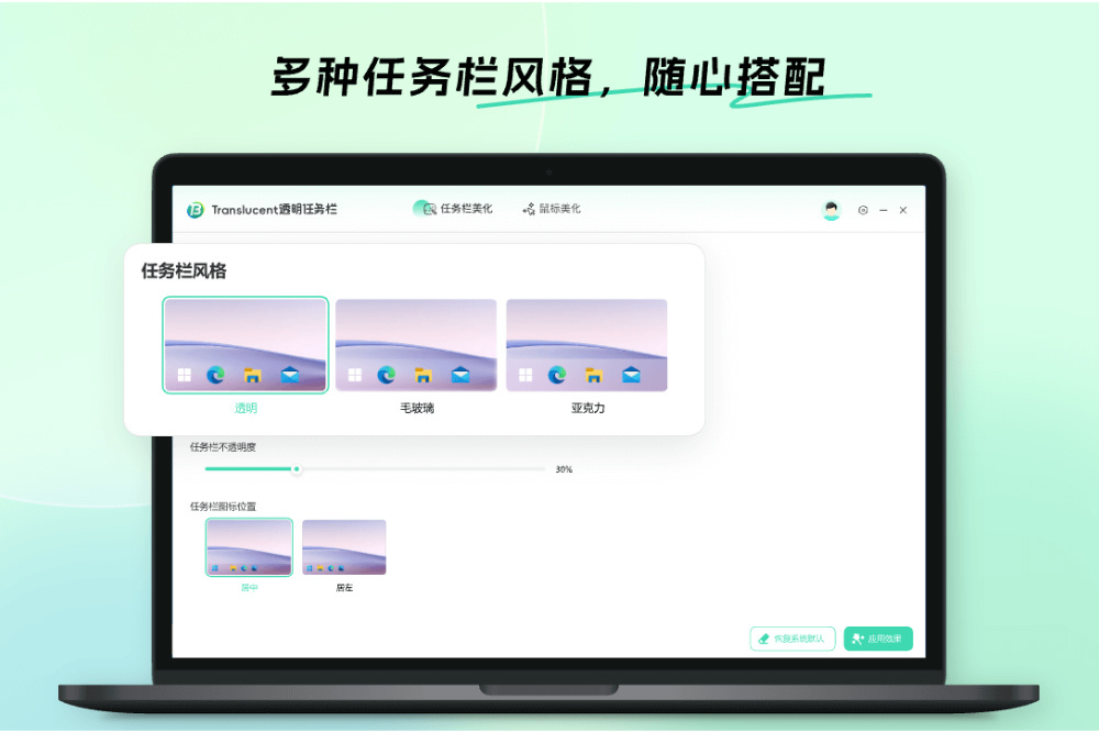精灵Translucent透明任务栏是一款适用于Windows系统的任务栏美化工具,让用户可以轻松调整任务栏的透明度与颜色,使其与桌面背景完美融合,定制个性化电脑桌面。 主要特点: 透明度、颜色定制:用户可以根据个人喜好调整任务栏的透明度与颜色,使其与桌面背景相适应,从而实现更加清爽、一体化的桌面风格; 多种模式选择:用户可以选择不同的透明模式,包括全透明、毛玻璃、亚克力等,以满足不同用户对于任务栏外观的需求; 易于使用:操作简单,用户通过简单的设置即可轻松定制任务栏的外观; 美化工具:多款鼠标皮肤、鼠标动效自由搭配,你的桌面由你定义; 兼容性强:精灵Translucent透明任务栏兼容了Win7、Win8、Win9及Win11系统,并提供了稳定可靠的运行环境,保证用户在不同系统版本下的良好体验。