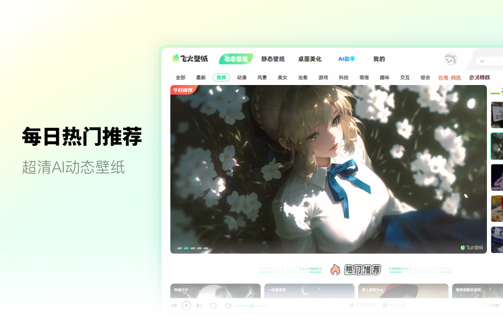 飞火动态壁纸坐拥100W+资源组合,每日推荐4K超清壁纸,全平台组件全免,并支持DIY搭配 !!! 仅需一个软件即可搞定:苹果同款dock、鼠标美化、任务栏美化、桌面时钟、音乐频谱等,轻松拥极具设计与美感的电脑桌面。 另外!!!飞火已接入AI语言大模型、AI图文大模型、AI视频大模型,大家可以尽情使用。